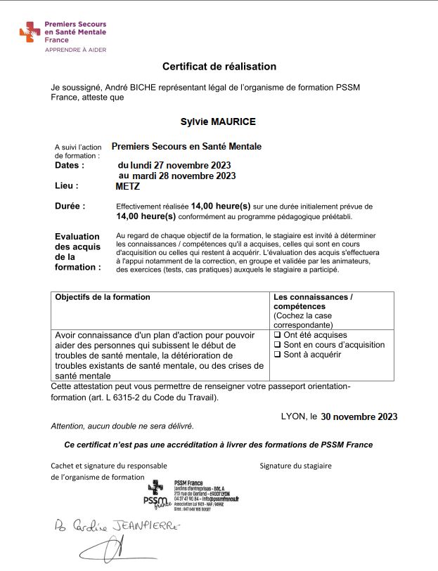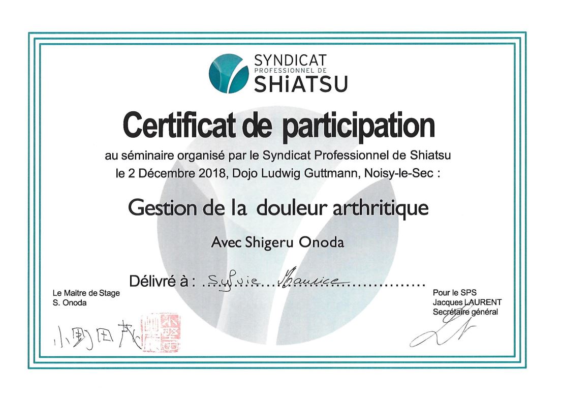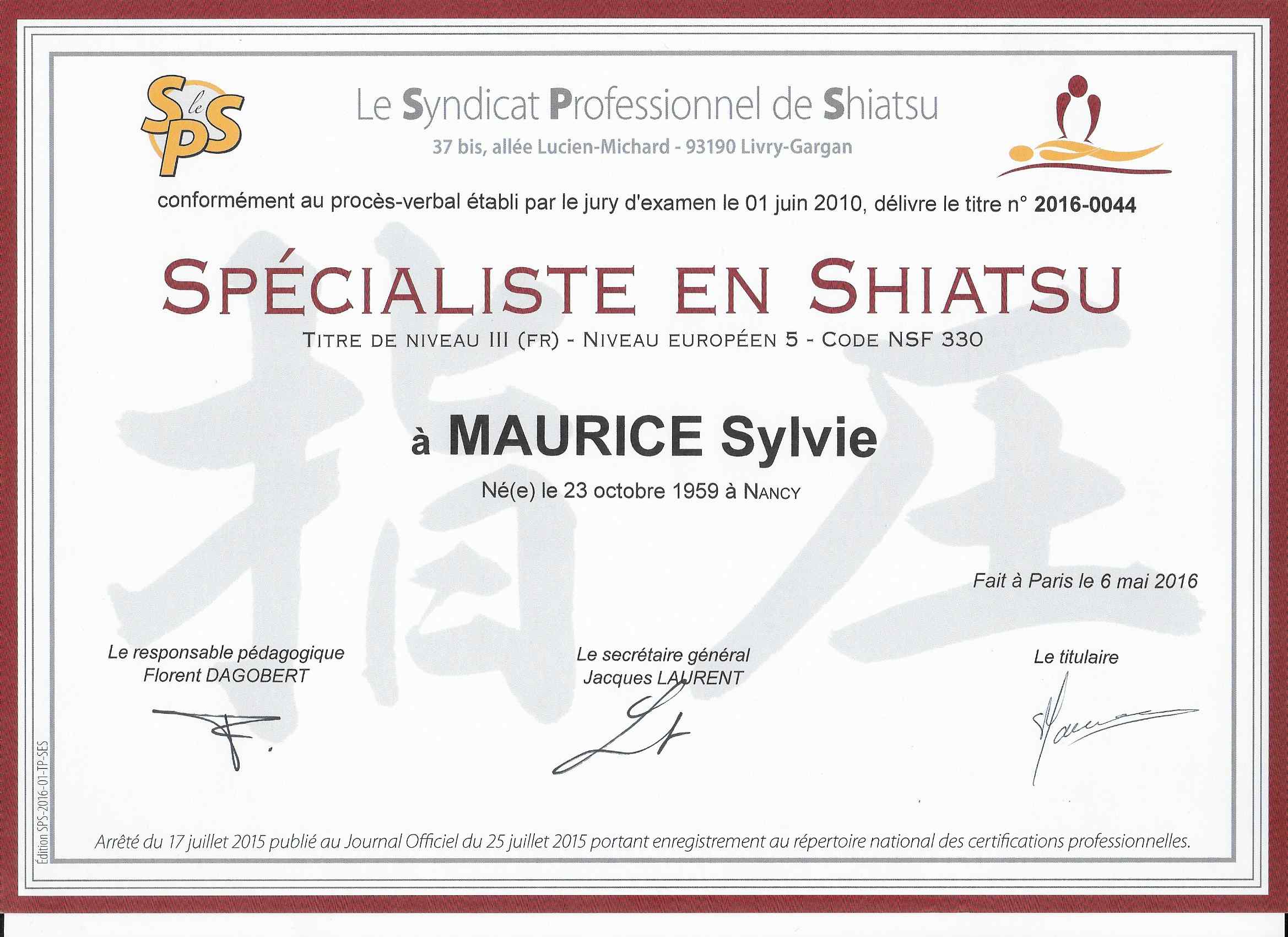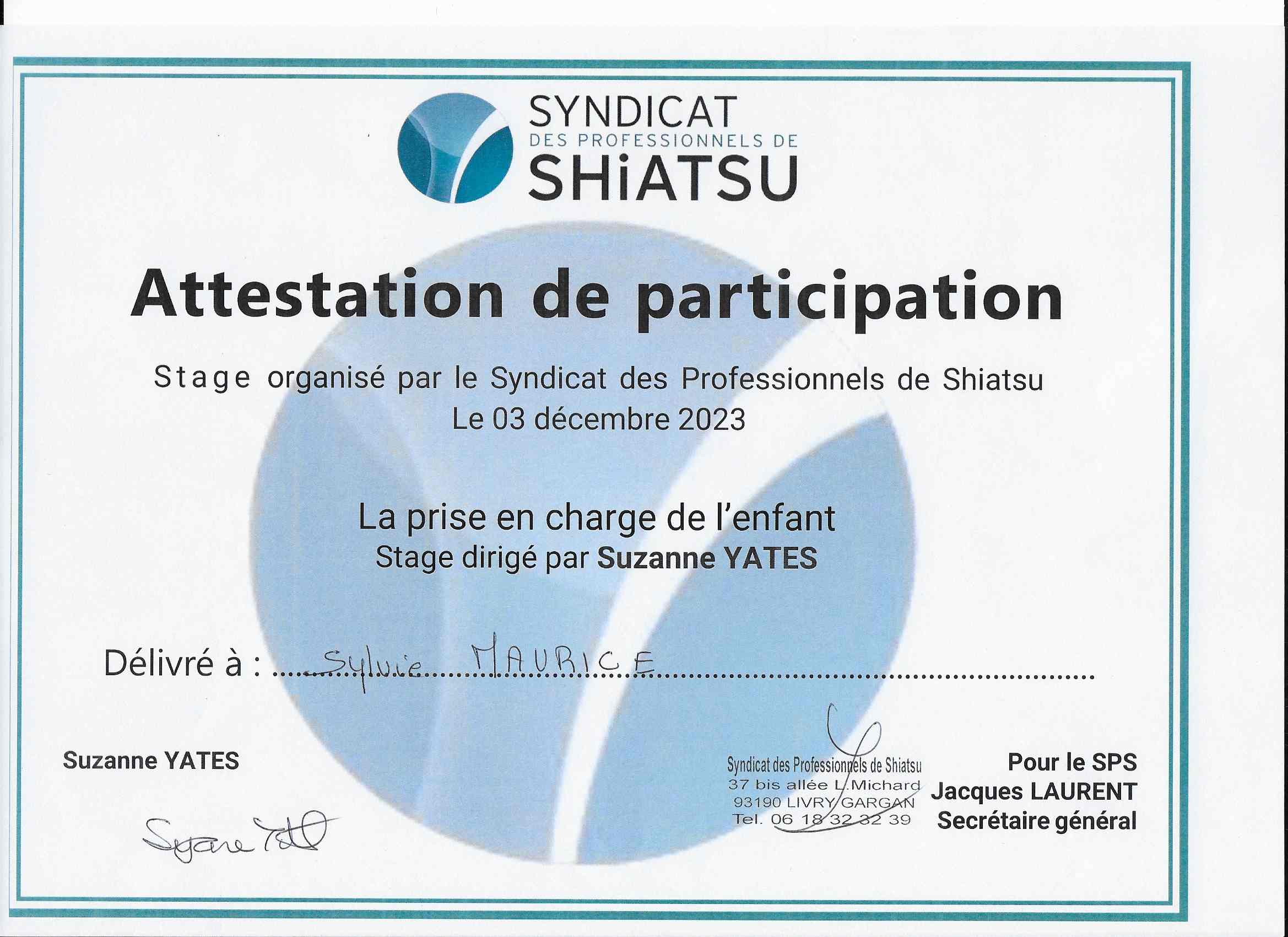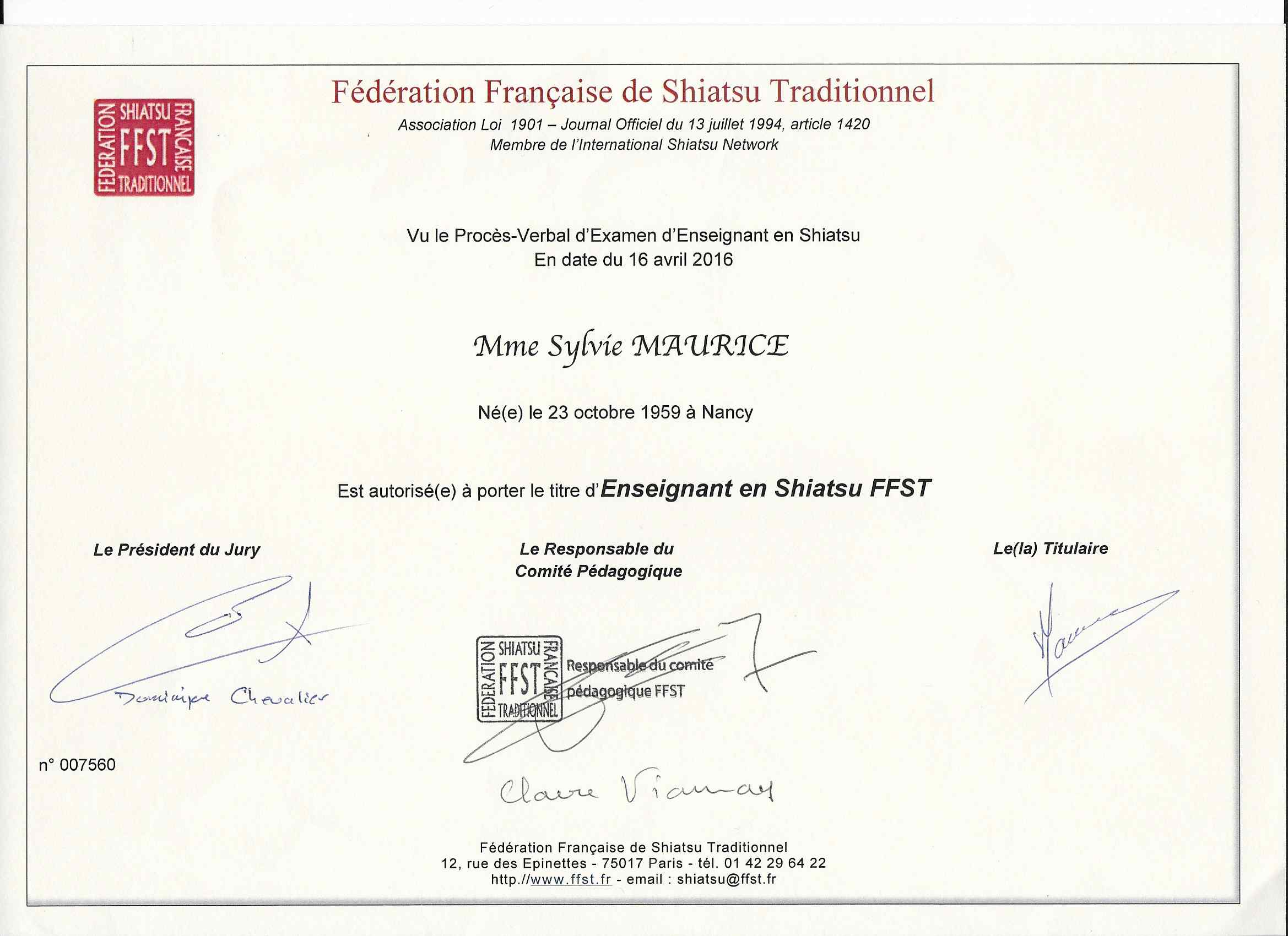 Française de Shiatsu traditionnel (FFST) et de spécialiste en Shiatsu selon les critères du Syndicat professionnel de Shiatsu (SPS).